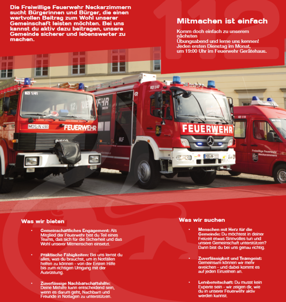 Für alle, die Interesse an der Feuerwehrarbeit haben: wir suchen immer noch Verstärkung und freuen uns auf ein Kennenlernen – einfach melden!